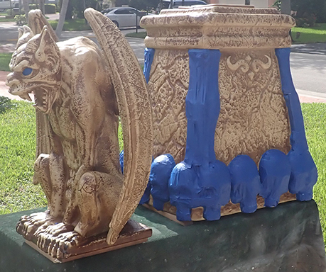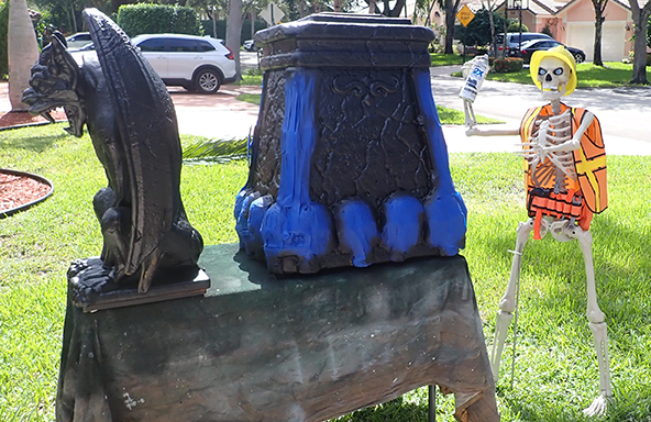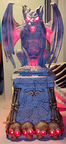 Modified the gargoyle purchased from Home Depot last year. Dry painted grey and added LED eyes to the skulls.