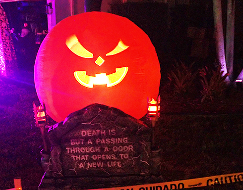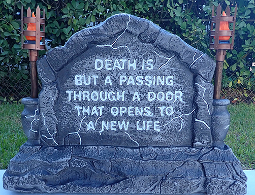 Modified a tombstone purchased from Home Depot. Painted letters & cracks with grey latex outdoor paint. Made torches using fake flames purchased from Amazon.